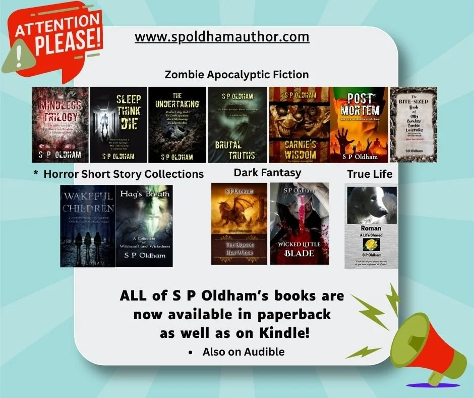 Thank you for all the support, interest and encouragement. Links to all of my books are available via their individual pages here on my website, or just type ‘S P Oldham, Author’ into Amazon and it should take you right to them.